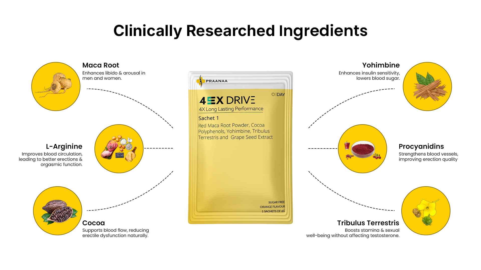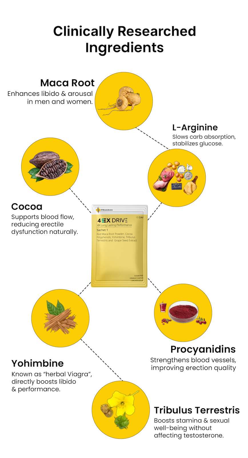 Yellow Sachet: After breakfast for energy, mood, and stamina. Blue Sachet: 30 minutes before intimacy for connection, confidence, and performance.